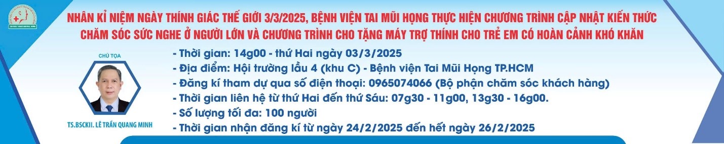 Phụ huynh có trẻ nghe kém có hoàn cảnh khó khăn chưa có điều kiện mua máy trợ thính và bệnh nhân người lớn muốn đăng kí tham dự chương trình “Cập nhật cập nhật kiến thức chăm sóc sức nghe ở người lớn” xin vui lòng đăng kí qua số điện thoại:  0965074066 (Bộ phận chăm sóc khách hàng),