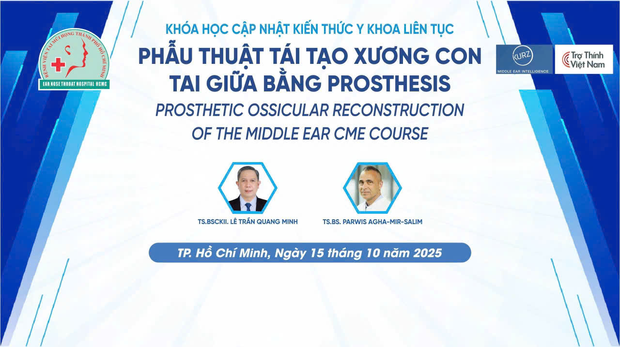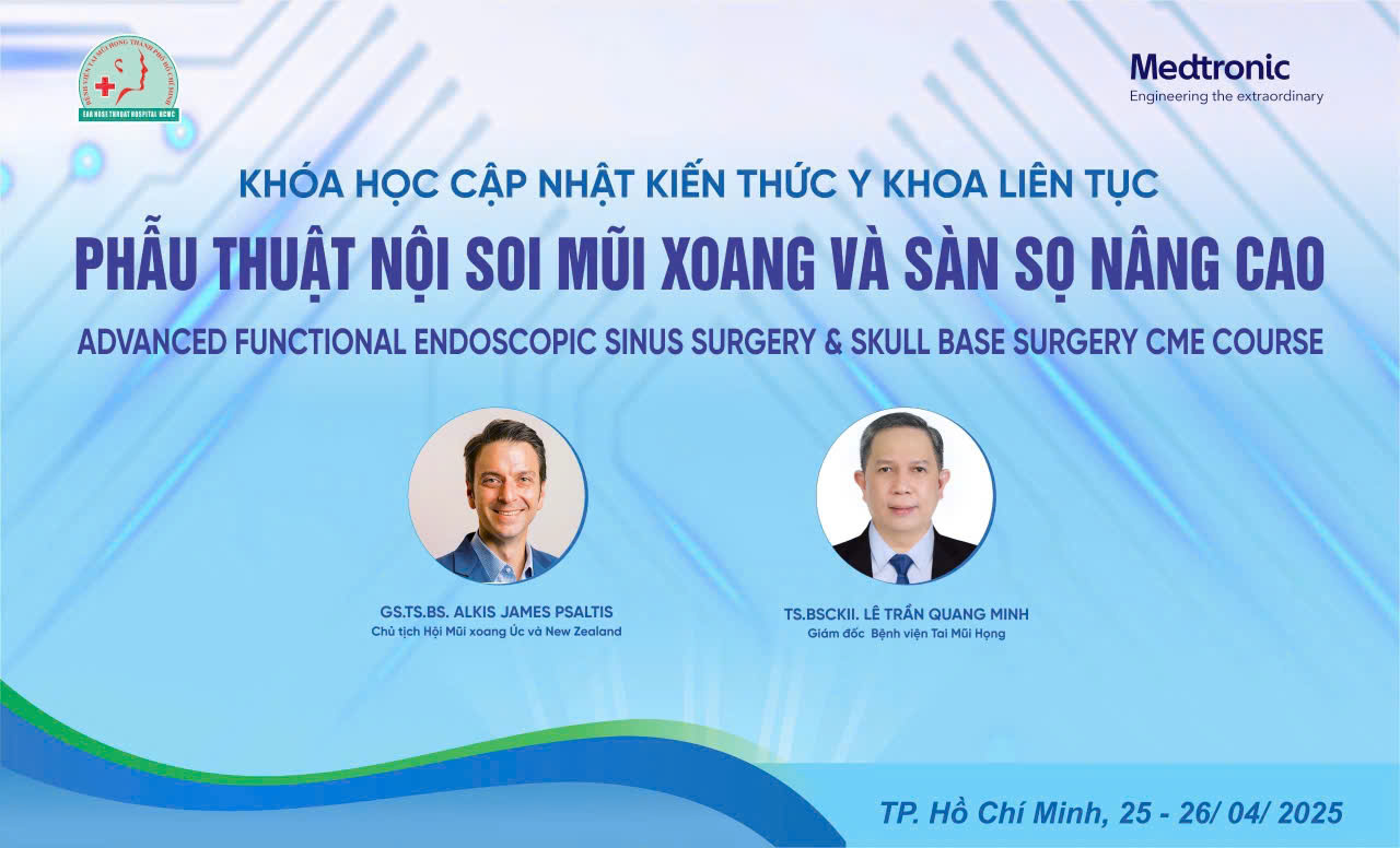 Xem chi tiếtTHÔNG BÁO CHIÊU SINH KHÓA HỌC CẬP NHẬT KIẾN THỨC Y KHOA LIÊN TỤC “PHẪU THUẬT NỘI SOI MŨI XOANG VÀ SÀN SỌ NÂNG CAO 2025” GS.TS.BS Alkis James Psaltis (Úc) Chủ tịch Hội Mũi Xoang Úc và New Zealand Trưởng khoa Tai Mũi Họng, Phẫu thuật đầu cổ – Bệnh viện The Queen […]
