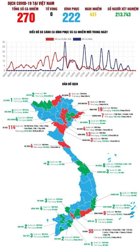 Đọc thêm >>Cập nhật lúc 6h ngày 26-4 của Ban chỉ đạo quốc gia phòng chống dịch COVID-19, tính từ 18h ngày 25-4 đến 6h sáng 26-4, Việt Nam không ghi nhận ca nhiễm mới. Tổng số ca bệnh cả nước vẫn là 270 ca, trong đó 225 ca đã khỏi. Hiện còn 45 trường hợp, trong […]
