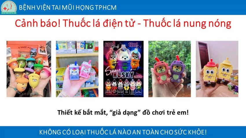 Thuốc lá điện tử ngày nay đã len lỏi vào trong các trường học với những hình thức tưởng chừng như đồ chơi của trẻ em, báo cáo viên cũng đã đưa ra những hình ảnh minh họa để người bệnh và người nhà người bệnh có thể dễ dàng hơn trong việc quản lý con em của mình tại nhà, tránh khỏi tác hại của thuốc lá điện tử.