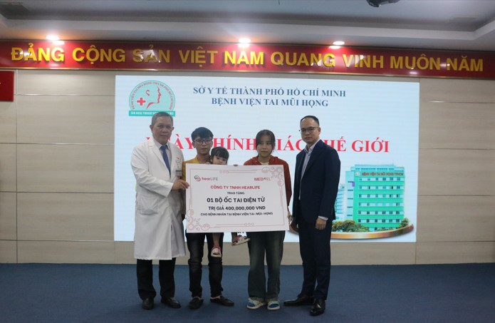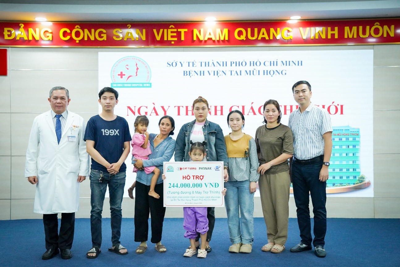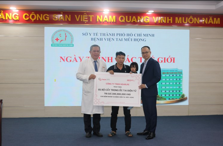 Để hỗ trợ người bệnh có hoàn cảnh khó khăn, trong chương trình, Bệnh viện Tai Mũi Họng TP.HCM phối hợp với đại diện nhà tài trợ công ty trợ thính Cát Tường tiến hành trao tặng thiết bị gồm 04 máy trợ thính cho 04 bệnh nhân có hoàn cảnh khó khăn với tổng trị giá là 244 triệu. Ngoài ra, Bệnh viện cùng đại diện nhà tài trợ công ty MEDEL tiến hành trao tặng thiết bị cấy ốc tai điện tử cho 2 người bệnh trẻ em có hoàn cảnh khó khăn với tổng trị giá là 600 triệu.