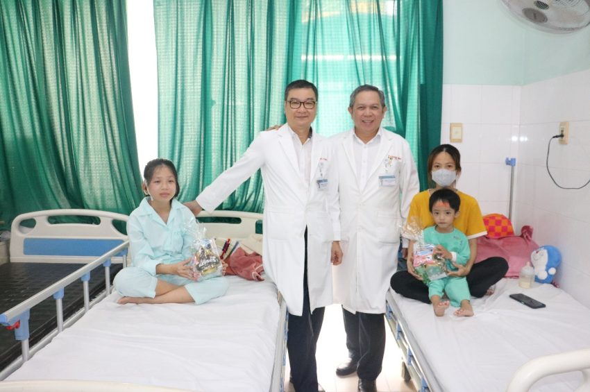 TS.BSCKII Lê Trần Quang Minh – Giám đốc bệnh viện cùng TS.BSCKII Nguyễn Thanh Vinh (đeo kính) – Phó Giám đốc bệnh viện trao quà cho bệnh nhi đang nằm điều trị nội trú tại khoa Nhi-Tổng hợp