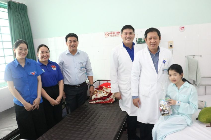 BSCKII Khưu Minh Thái – Phó Giám đốc bệnh viện cùng BCH Công đoàn, Đoàn thanh niên trao quà cho bệnh nhi tại khoa Nhi-Tổng hợp