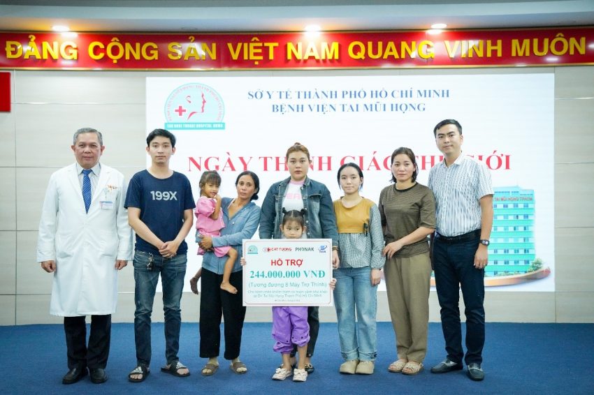 - Để hỗ trợ người bệnh có hoàn cảnh khó khăn, Bệnh viện Tai Mũi Họng phối hợp với đại diện nhà tài trợ công ty trợ thính Cát Tường tiến hành trao tặng thiết bị gồm 04 máy trợ thính cho 04 bệnh nhân có hoàn cảnh khó khăn với tổng trị giá là 244 triệu. Ngoài ra, Bệnh viện cùng đại diện nhà tài trợ công ty Medel tiến hành trao tặng thiết bị cấy ốc tai điện tử cho 2 người bệnh trẻ em có hoàn cảnh khó khăn với tổng trị giá là 600 triệu.