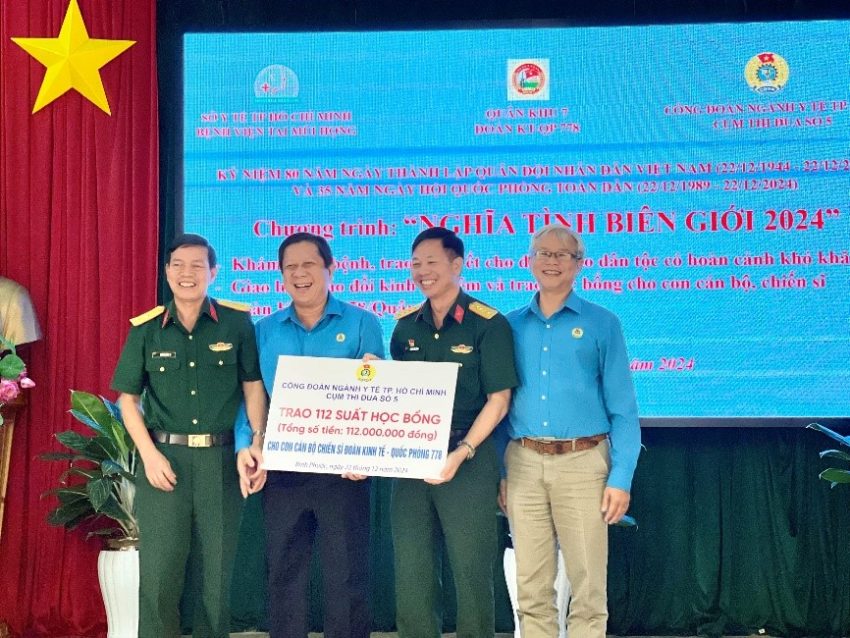 Đ/c Lương Văn Minh (bìa trái) và Đ/c Khưu Minh Thái (đứng giữa) đại diện Cụm thi đua số 5 – Công đoàn Ngành Y tế TPHCM trao biểu trưng 112 suất học bổng cho BCH Đoàn Kinh tế Quốc phòng 778