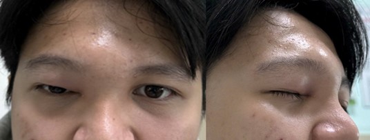 Hình: Bệnh nhân lúc đến khám, sưng phồng vùng trán (P) và nề đỏ mi trên mắt (P)