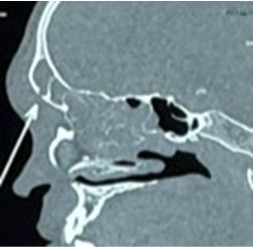 Hình: CT scan mũi xoang ghi nhận viêm đa xoang và vùng hủy xương thành trước xoang trán (P).
