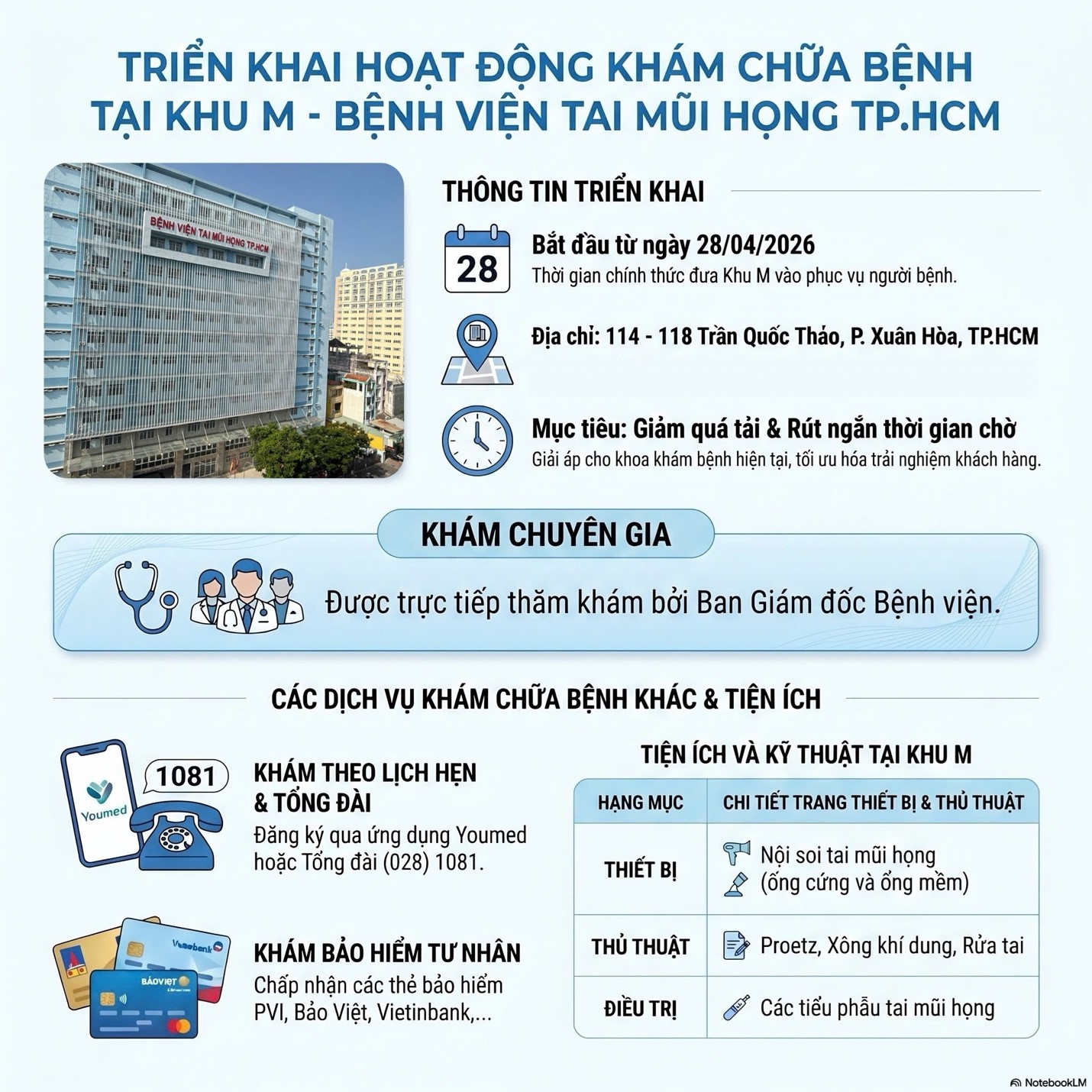 Nhằm nâng cao chất lượng phục vụ và giảm tải cho khu khám hiện tại, Bệnh viện Tai Mũi Họng TP.HCM chính thức triển khai tăng cường hoạt động khám chữa bệnh tại Khu M kể từ ngày 28/04/2026 (hoạt động khám chữa bệnh ở địa chỉ cũ vẫn hoạt động bình thường)