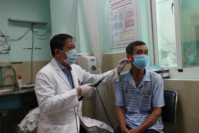 Bác sĩ chuyên khoa 2 Khưu Minh Thái, Phó Giám đốc kiêm Chủ tịch Công đoàn Bệnh viện Tai mũi họng TP HCM, khám bệnh cho bệnh nhân