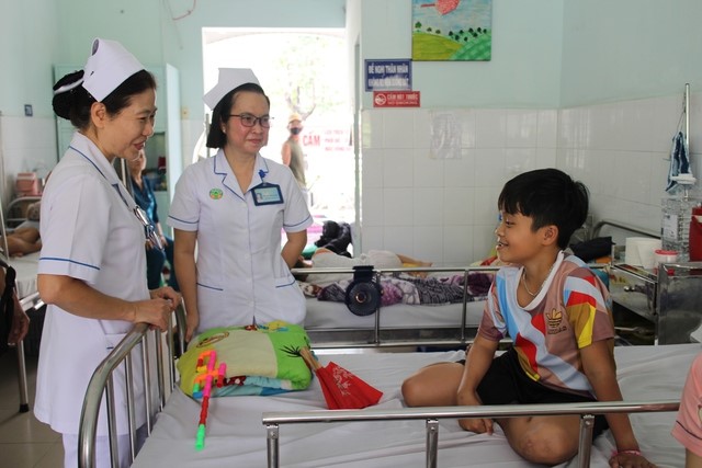 Trưởng phòng điều dưỡng kiêm Chủ tịch Công đoàn Bệnh viện Nhi đồng 2 TP HCM Phạm Lâm Lạc Thư (bìa trái) thăm hỏi bệnh nhi
